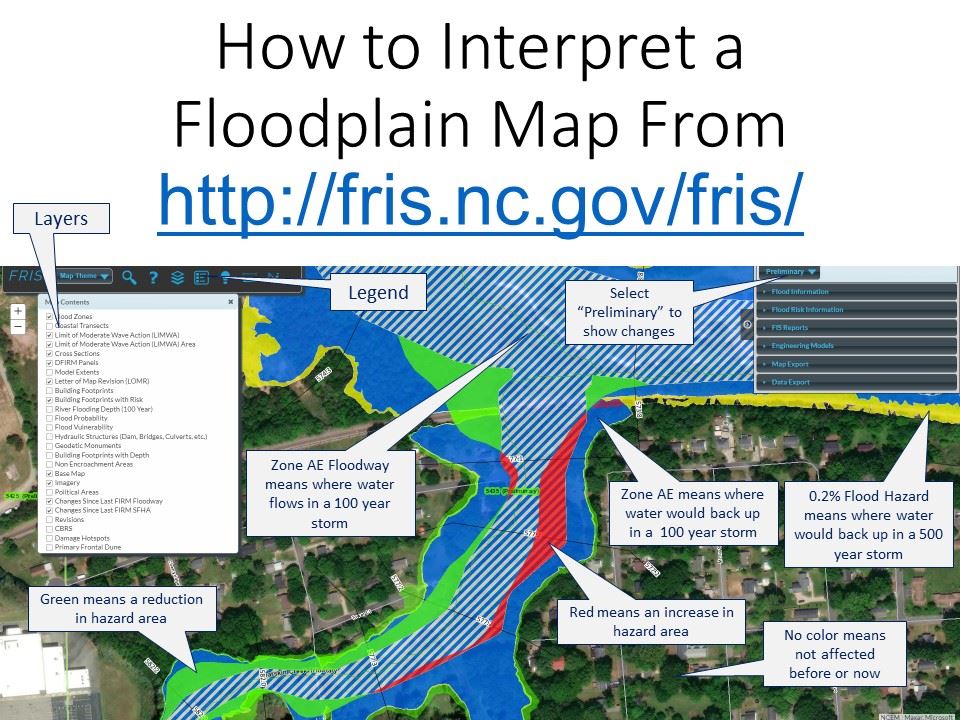 FEMA has been in the process of updating its FIRM Floodplain Maps in Union County for the past couple of years. Some property owners will receive a letter in the mail because their property is proposed to be affected by the updated floodplain delineations. Map maintenance revisions are based on community-requested flood hazard data needs for specific streams. The revisions include changes to streams reflected on the affected map maps for Union County. You are encouraged to review the updated floodplain data at NCFMP’s webpage (http://fris.nc.gov/fris/). The NCFMP’s webpage allows you to review the data. Click on the graphic below to help you understand the different colors shown on the maps.