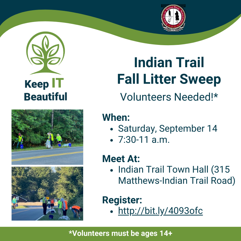 As part of its Keep IT Beautiful initiative, the Town of Indian Trail is hosting its annual Fall Litter Sweep on Saturday, Sept. 14, from 7:30-11 a.m.