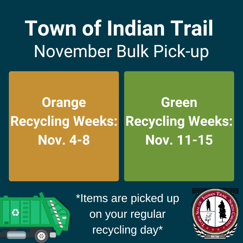 Curbside Bulk and E-waste Pickup will occur Nov. 4-8 for Orange Recycling Weeks and Nov. 11-15 for Green Recycling Weeks. Items will be picked up on your regular recycling day during that time.